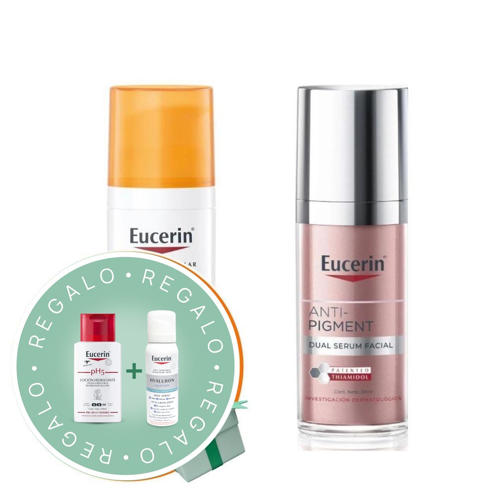 Este pack de Eucerin combina el Sérum Anti-Pigment Dual, que reduce y previene manchas oscuras, con el protector solar Pigment Control FPS 50, que protege del sol y previene la hiperpigmentación. Ideal para una rutina completa de día, mejora visiblemente el tono de la piel y le devuelve su luminosidad.