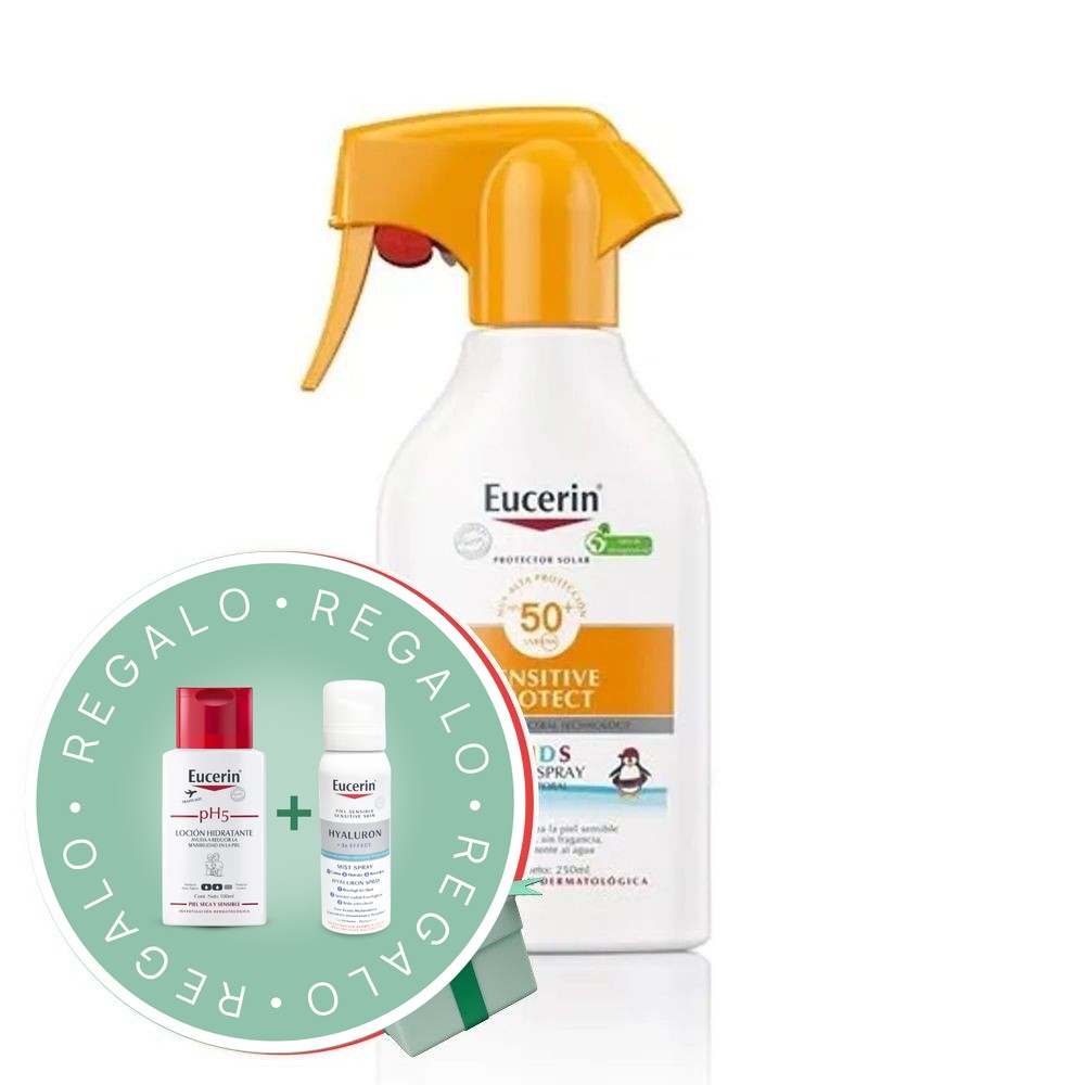 - Eucerin® Sun Kids Sensitive Protect Spray Trigger FPS50+ es un protector solar para niños especialmente formulado para calmar la piel sensible y protegerla de las quemaduras solares y de los daños inducidos por el sol a largo plazo.