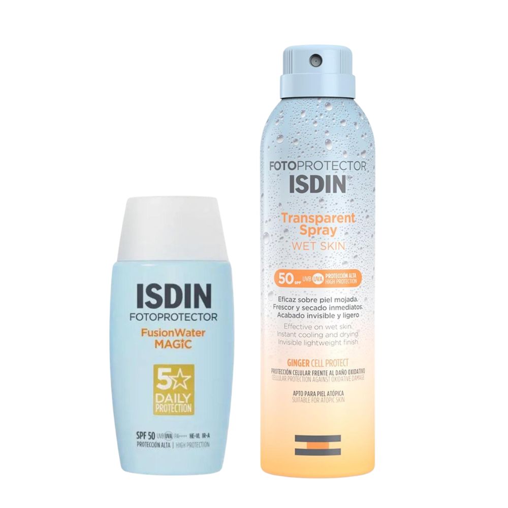 – Fotoprotector ISDIN Transparent Spray Wet Skin 250ml.¡Protección solar completa de ISDIN para tu día a día y tus aventuras al aire libre! Este pack incluye dos fotoprotectores de alta gama. El Fusion Water Magic SPF 50 es un protector facial con textura ultraligera de fase acuosa, de absorción inmediata y acabado sedoso que se funde con la piel. Proporciona alta protección UVA/UVB, hidratación profunda y acción antioxidante para el rostro. El Transparent Spray Wet Skin SPF 50 es un protector corporal en spray, transparente, fresco y de secado inmediato. Su tecnología Wet Skin permite aplicarlo sobre piel mojada o seca sin dejar residuo blanco, y es resistente al agua. Su fórmula con Ginger Cell Protect ofrece protección celular antioxidante. La combinación perfecta para cuidar tu piel de manera integral, con productos aptos para todo tipo de pieles, incluyendo la sensible. ¡Tu escudo invisible contra el sol!