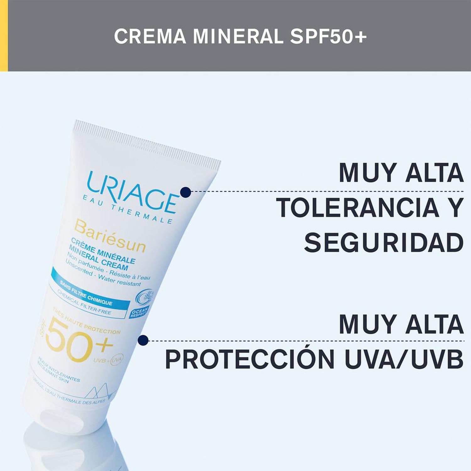 ¡Protección solar de alta tolerancia para toda la familia! URIAGE BARIESUN SPF50+ es una crema solar mineral con filtros 100% minerales (Dióxido de Titanio y Óxido de Zinc) que respeta incluso las pieles más sensibles, atópicas o intolerantes. Su fórmula enriquecida con Agua Termal de Uriage fortalece la barrera cutánea, mientras protege eficazmente contra los rayos UVA, UVB y la luz azul. Ofrece una textura ligera, no grasa, de rápida absorción, resistente al agua y sin dejar desagradable acabado blanco. Hidrata, calma la piel y ayuda a prevenir el fotoenvejecimiento. ¡Tu aliado ideal para una protección segura y confiable bajo el sol!